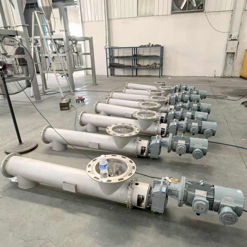 1. ينقل الناقل اللولبي المادة المختلطة من الخلاط الشريطي إلى ناقل لولبي أفقي
