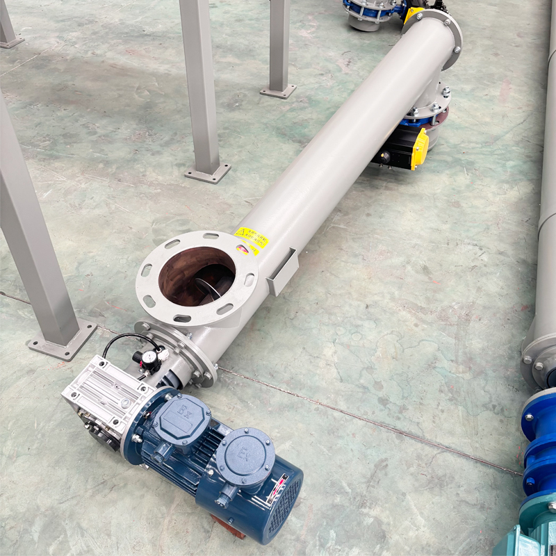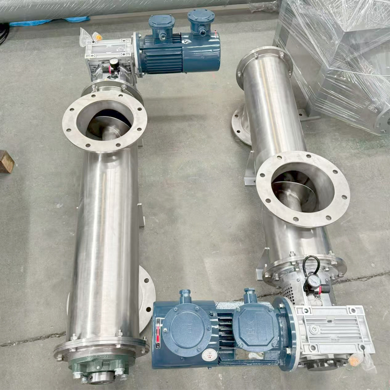 1. ينقل الناقل اللولبي المادة المختلطة من الخلاط الشريطي إلى ناقل لولبي أفقي