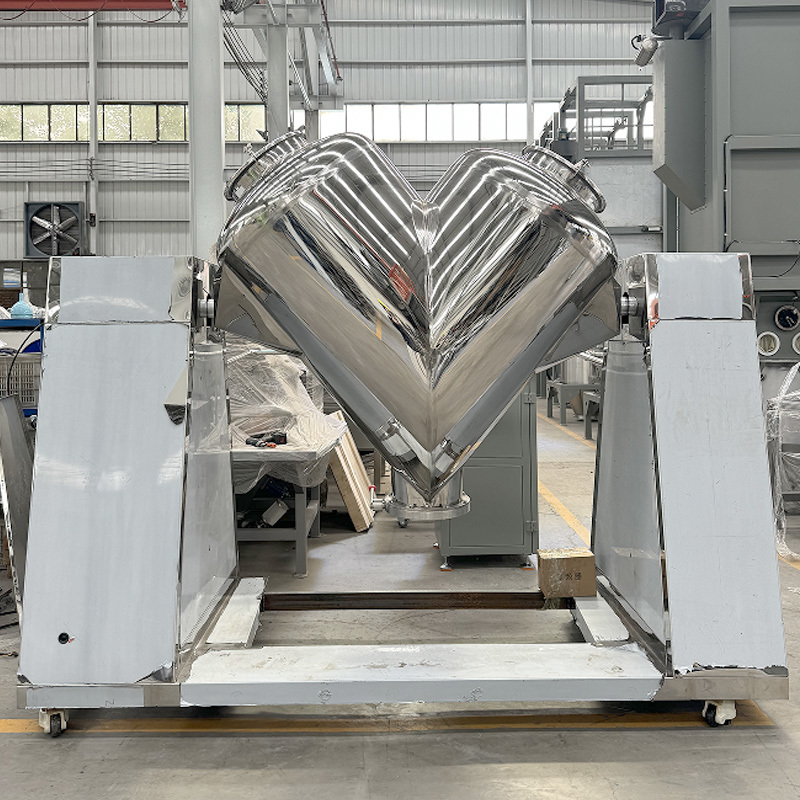 يعتمد مبدأ عمل الخلاط على شكل V على التدفق الجاذبية وانتشار خلط المواد داخل الحاوية الدوارة. بعد تشغيل المعدة، تدور الأسطوانة على شكل حرف V بسرعة ثابتة حول المحور الأفقي، وتتحرك المواد معها. بسبب عدم تناسق الهيكل على شكل حرف V، تخضع المواد للفصل والدمج وإعادة التنظيم المستمر أثناء الدوران: فهي تسقط من النقاط العالية لذراعي الأسطوانة إلى مركز القاع ثم تختلط معًا، ثم يتم رفعها بواسطة جسم الأسطوانة ونقلها إلى الجانبين، لتشكل عملية دورية من التقارب - الارتفاع - التشتت. يتيح هذا الحمل الحراري المتكرر والتشابك داخل الفضاء ثلاثي الأبعاد للمكونات المختلفة للمواد تحقيق توزيع سريع وموحد في ظل حركة ميكانيكية لطيفة. العملية برمتها لا تولد احتكاكًا أو قصًا شديدًا، ويمكنها الحفاظ على الخصائص الفيزيائية للمواد بشكل أفضل.